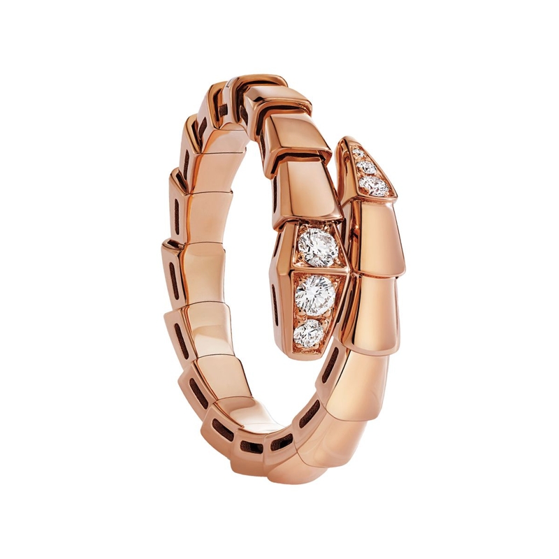 8K 로즈골드에 다이아몬드가 파베 세팅된 세르펜티 바이퍼 링은 5백40만원, Bvlgari.