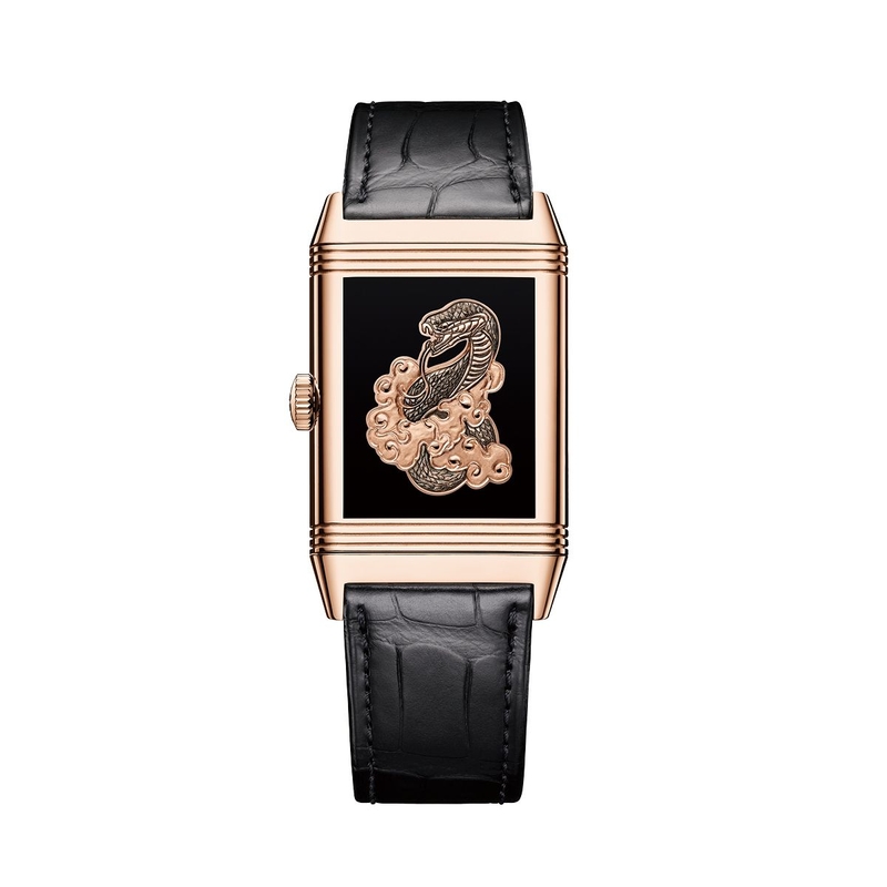 핑크골드 메탈 케이스에 수공으로 인그레이빙한 스네이크 모티프가 특징인 리베르소 트리뷰트 에나멜 스네이크 워치는 가격 미정, Jaeger Le Coultre.